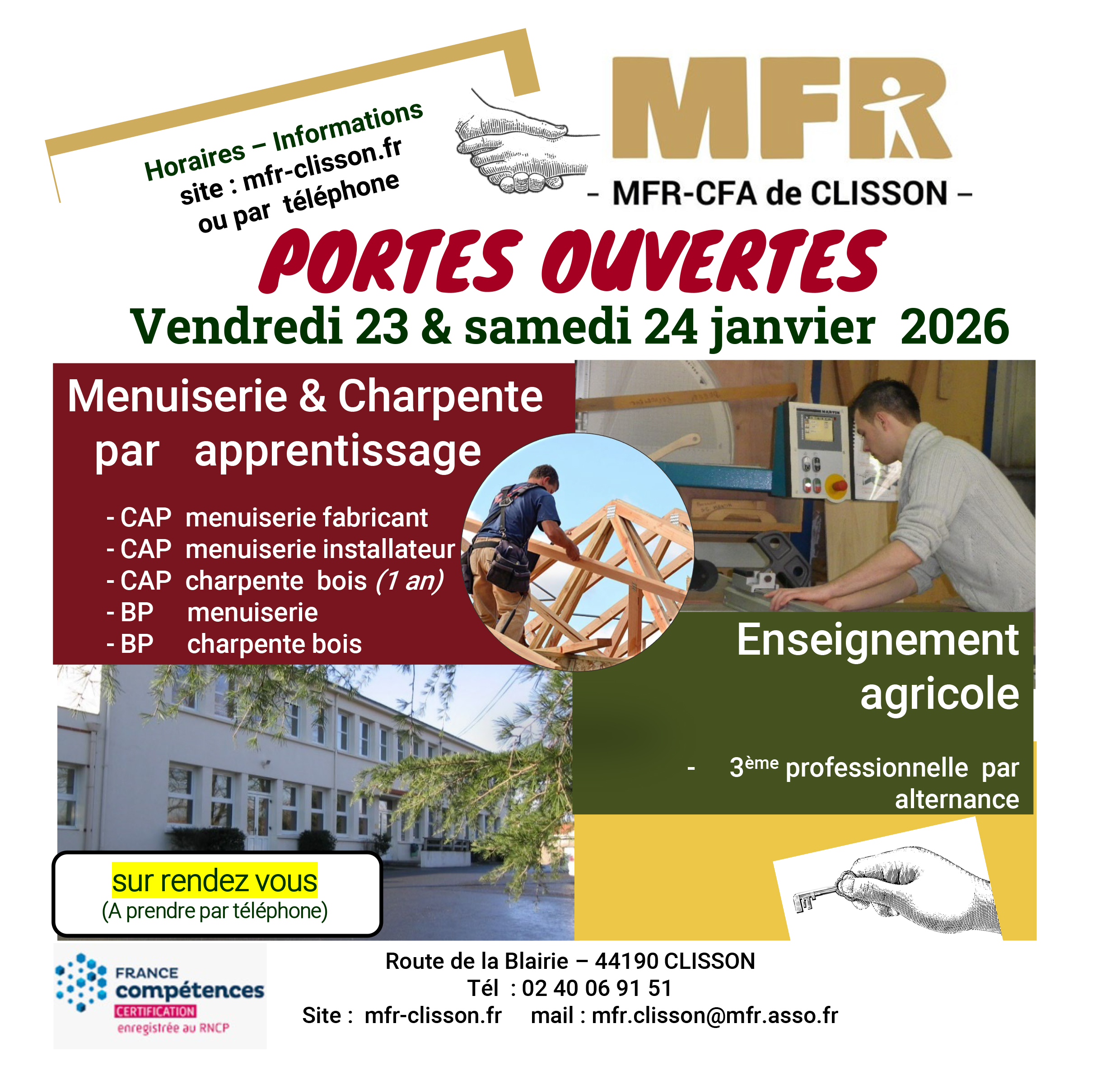 Vendredi 23 & samedi 24 janvier 2026 venez découvrir nos formations : Menuiserie & Charpente par apprentissage Enseignement agricole